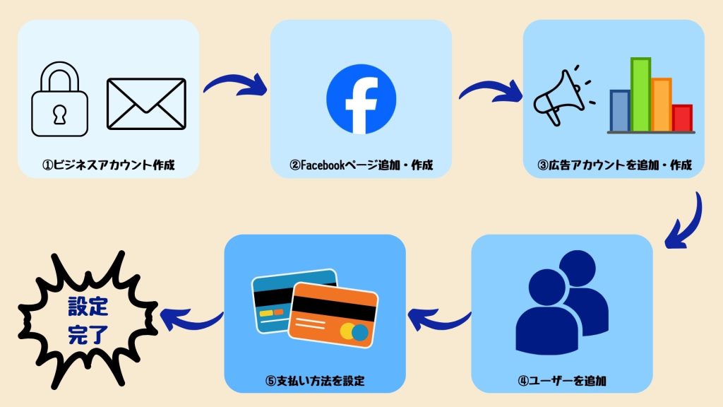 Meta広告を始めるには、まず「Metaビジネスマネージャー」で環境を整えます。これは広告アカウントやFacebookページ、Instagramアカウントを一元管理できる“司令塔”のような存在です。