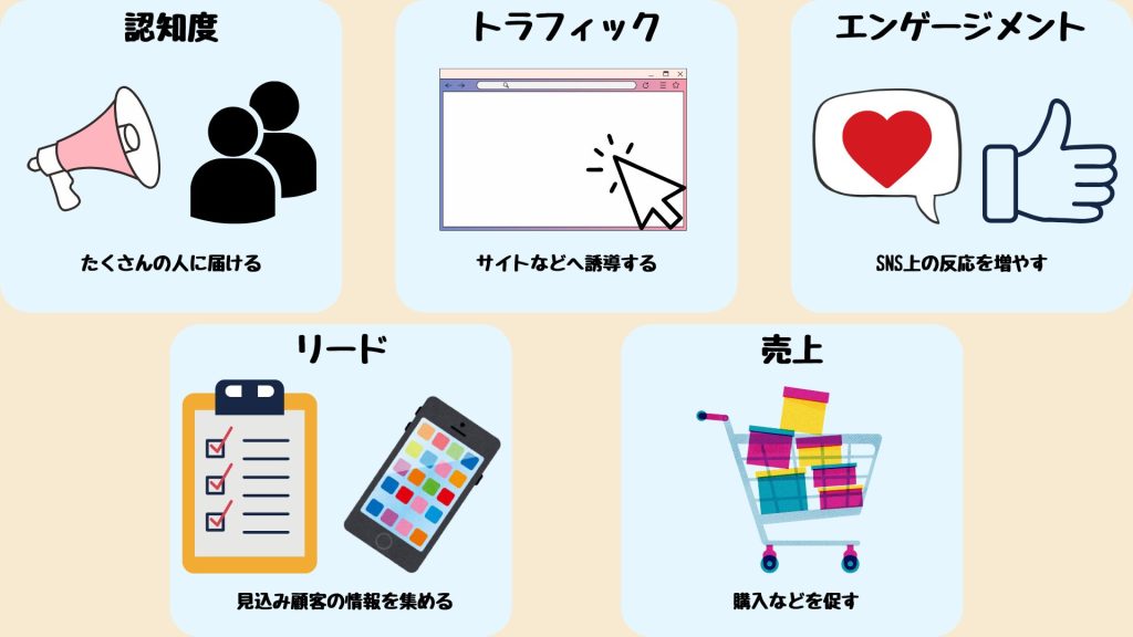 広告マネージャでは、目的に応じた目標が用意されています。代表的なものは以下の通りです。